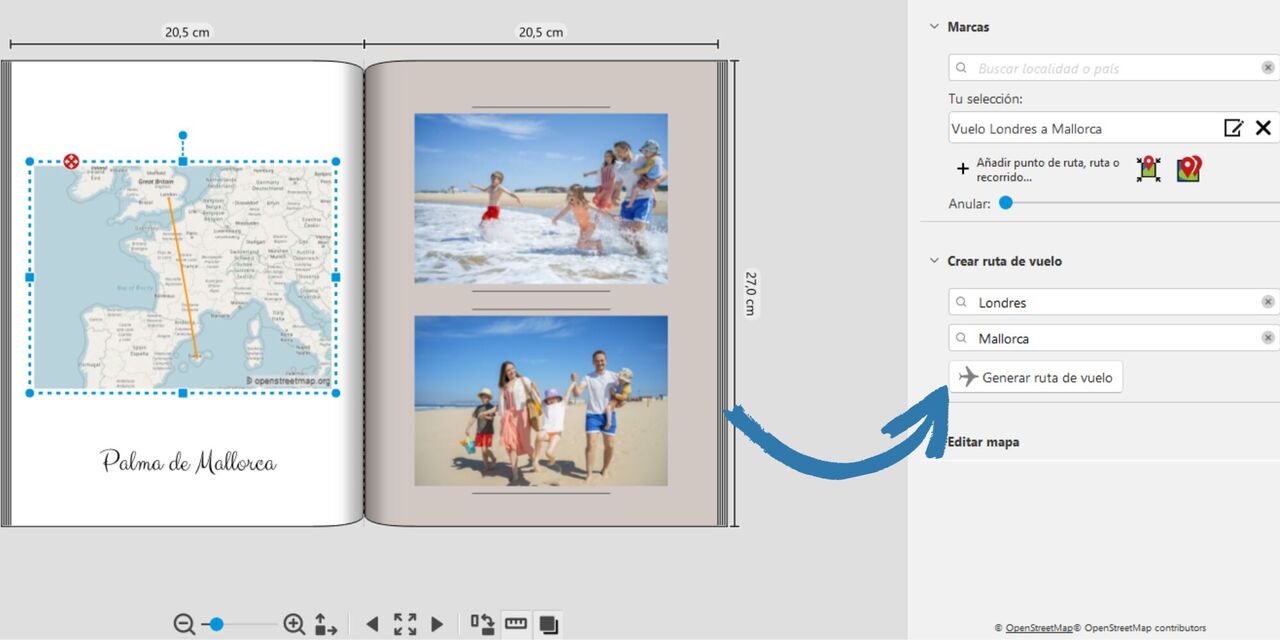 Haz clic en tu mapa y navega hasta el menú «Editar» situado a la derecha de tu pantalla. Busca el título que dice «Crear una ruta de vuelo». Para trazar tu ruta de vuelo, sólo tienes que introducir tus ubicaciones de salida y destino, y hacer clic en el botón «Generar ruta de vuelo». Tu álbum digital con mapa mostrará entonces la ruta que has seguido durante tu viaje.