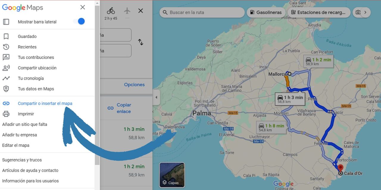 A continuación, selecciona el menú desplegable situado en la esquina superior izquierda y haz clic en la opción para compartir o insertar el mapa.