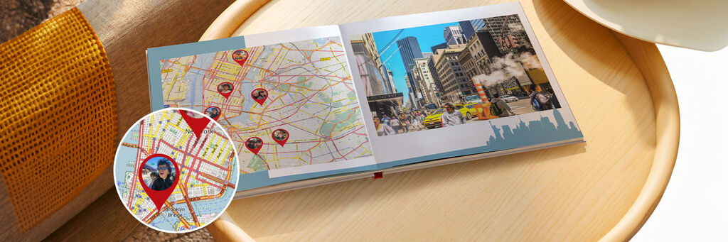 Añade un toque aventurero a tu álbum de fotos con un mapa que muestre tus expediciones trotamundos. Si añades un mapa a tu álbum de fotos, podrás registrar dónde se tomaron determinadas fotos, trazar tu ruta y marcar los lugares que te robaron el corazón.